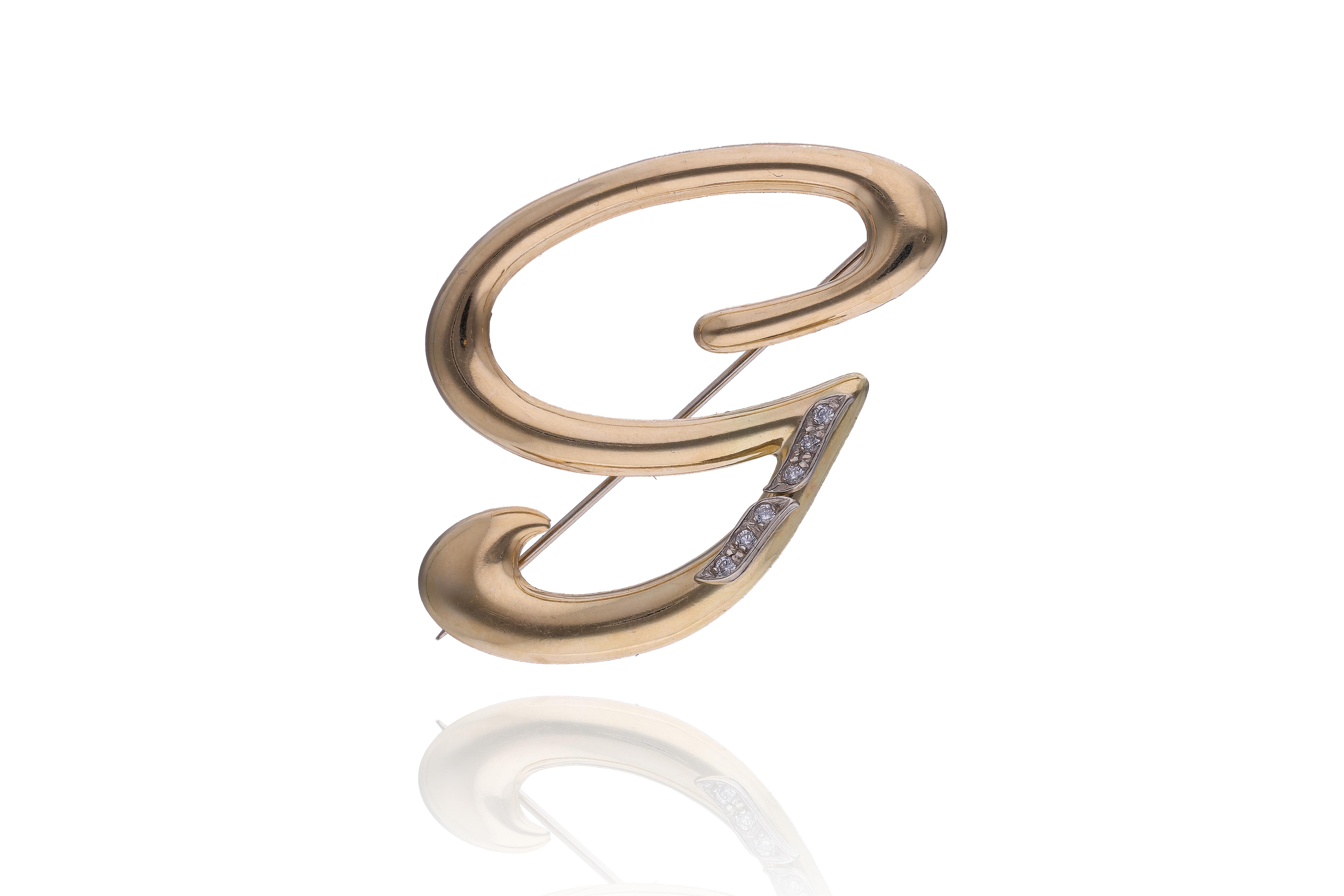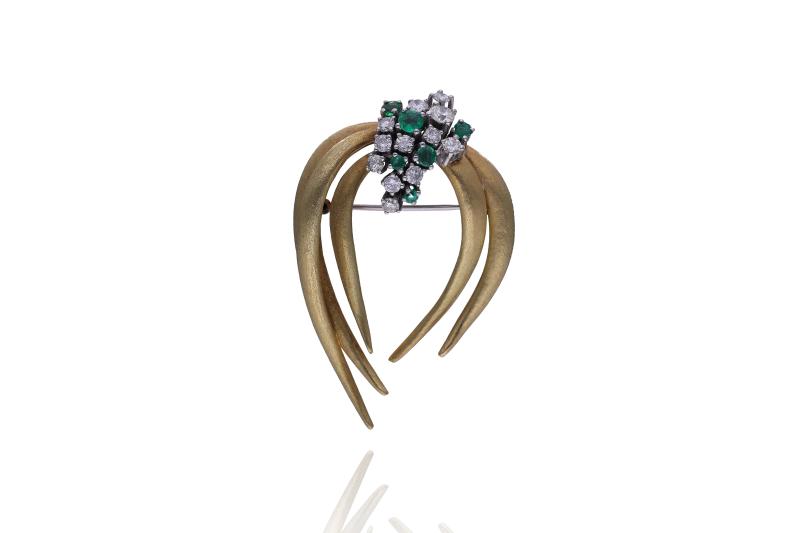 Spilla con diamanti e smeraldi, realizzata in oro bicolore 750, smeraldi taglio composito di forma rotonda, diamanti taglio brillante ct 0,75 totali circa, colore H-J, purezza VS-SI, imperfezioni