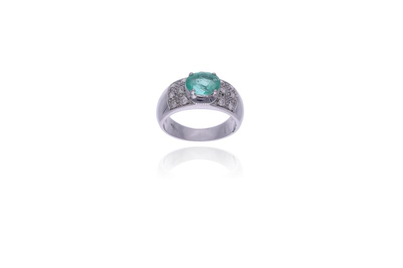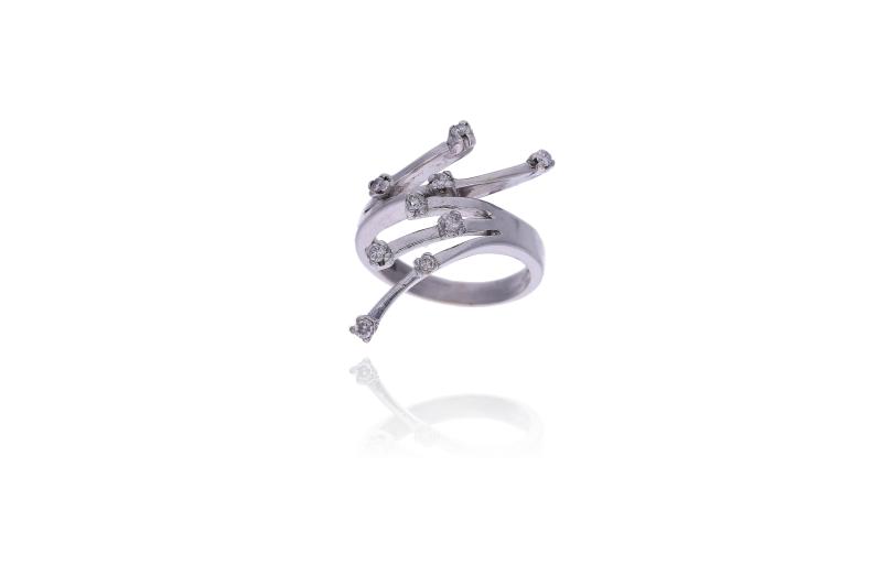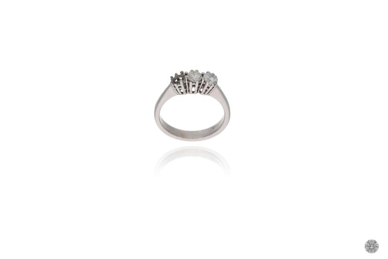 Anello con diamanti, realizzato in oro bianco 750, diamanti taglio brillante ct 0,55 totali circa, colore H-J, purezza VS-SI, 1 diamante staccato ct 0,18, griffe mancanti, misura 10,5, difetti