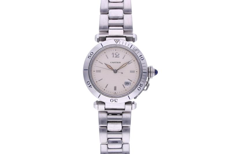 Cartier Pasha, orologio in acciaio, ref. 1040, movimento automatico, cal. 049, mat. CC36****, datario tra le ore quattro e le ore cinque, bracciale e fibbia bideployante Cartier in acciaio, dimensioni 38 mm, parti graffiate, sfere ossidate, difetti, si consiglia assistenza tecnica