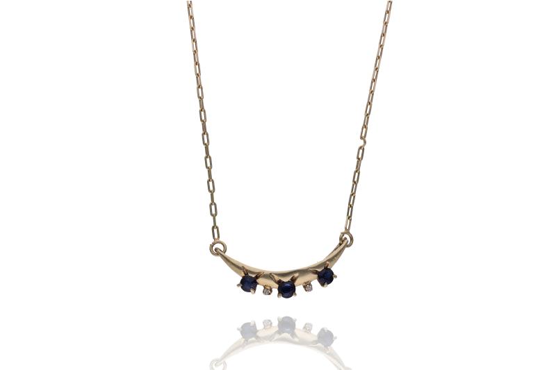 Collana con zaffiri e diamanti, realizzata in oro giallo 750, zaffiri taglio composito forma rotonda, affiancati da diamanti taglio huit-huit ct 0,02 totali, lunghezza cm 41,5, difetti