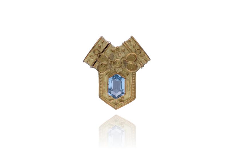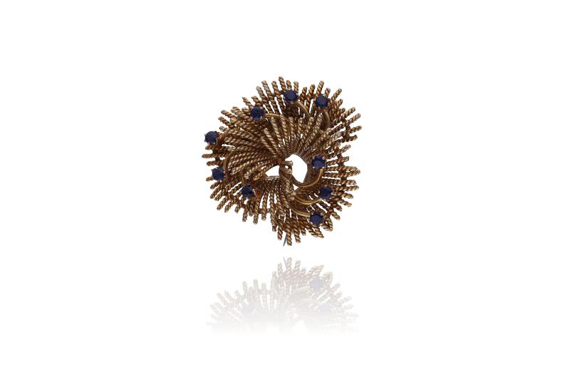 Spilla con zaffiri realizzata in oro 750, zaffiri rotondi taglio composito, punzoni ante 1969, imperfezioni