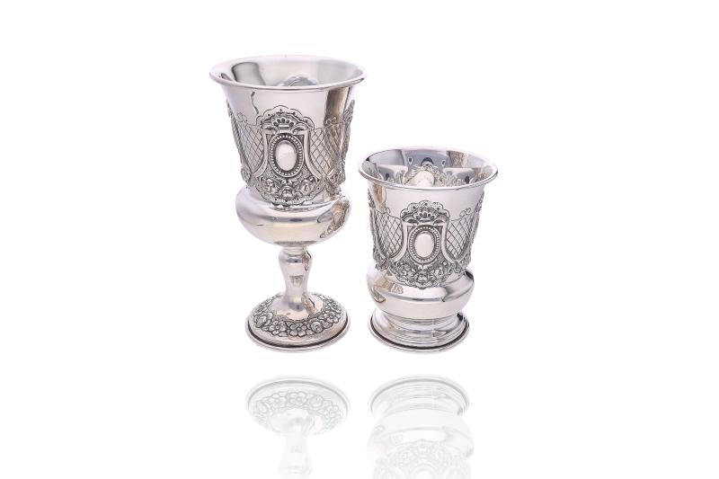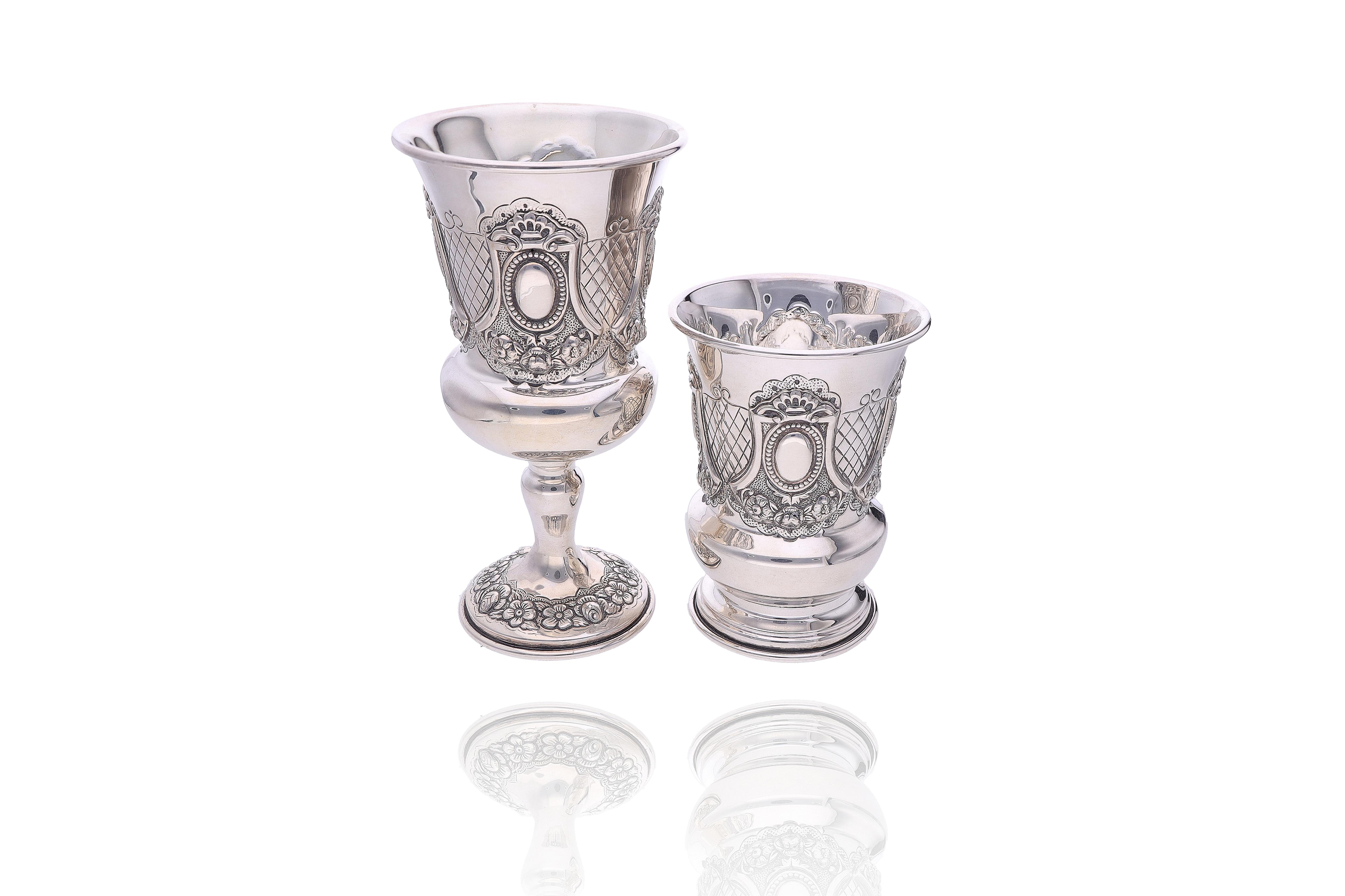 Hazorfim, calice e tumbler realizzati in argento 925 decorati con elementi floreali e festoni, h cm 14,5 e h cm 10, ammaccature, difetti