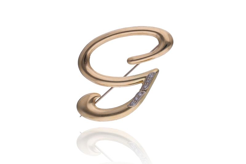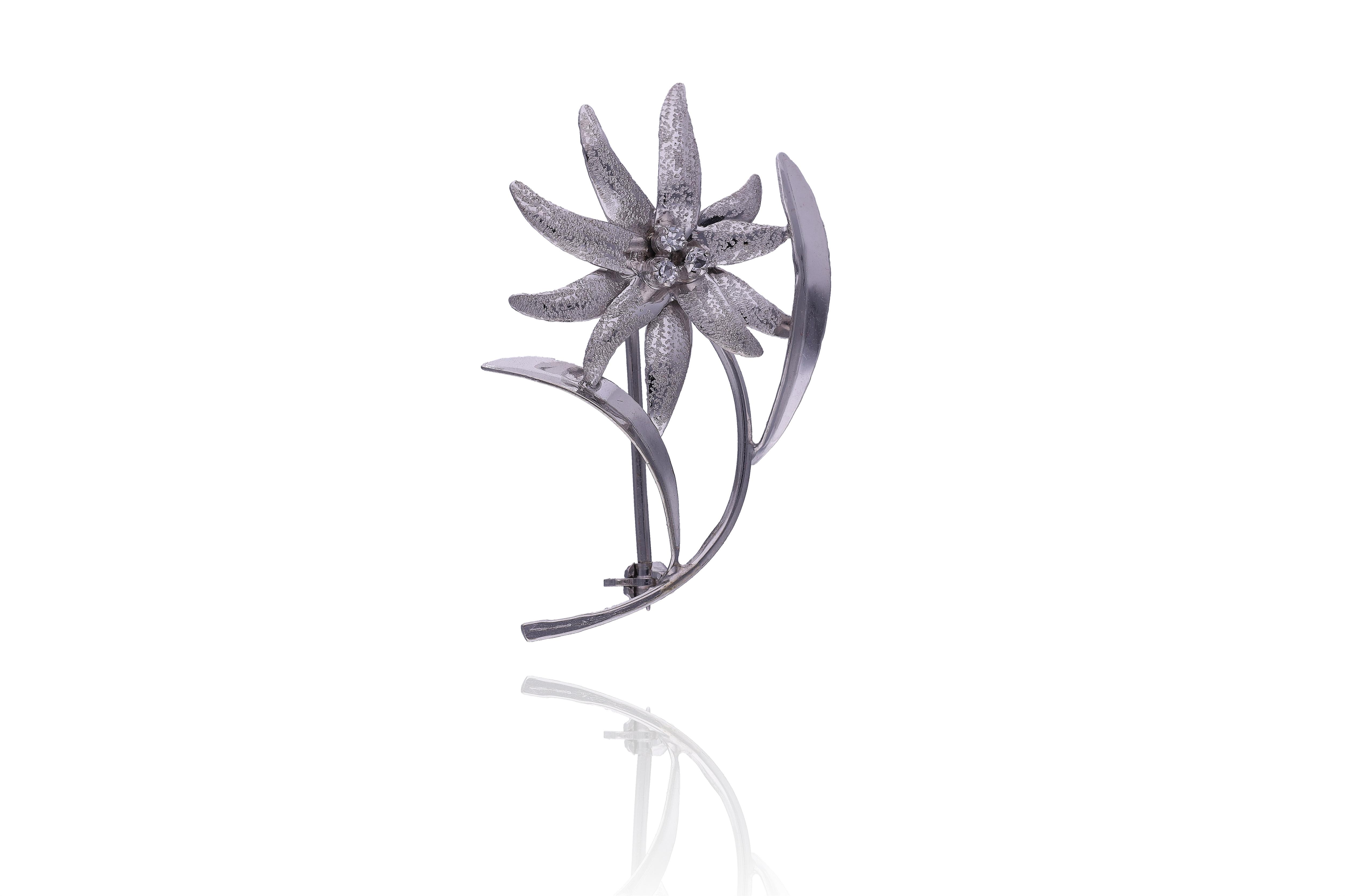 Spilla con diamanti e perle coltivate, realizzata in oro basso, diamanti taglio brillante e vecchio ct 0,50 totali circa, colore H-J, purezza VS-SI, perle coltivate 4-5 mm, imperfezioni