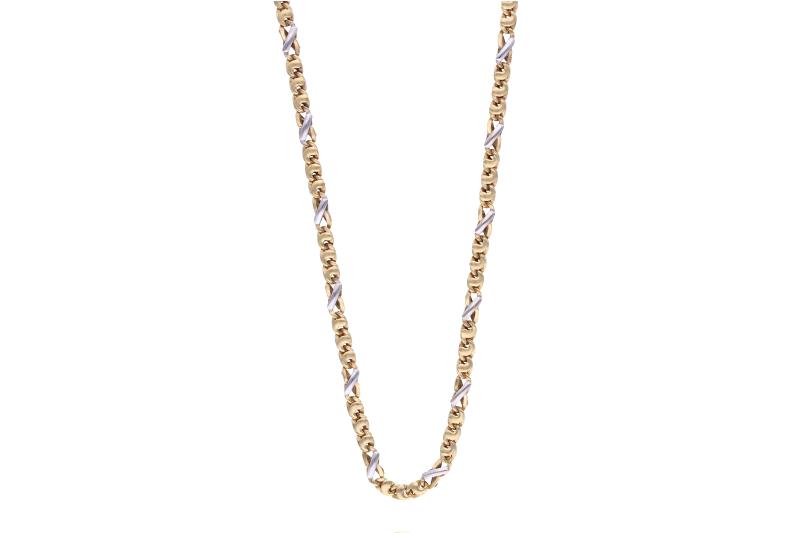 Collana realizzata con maglie modulari in oro bicolore 750, lunghezza cm 50, difetti