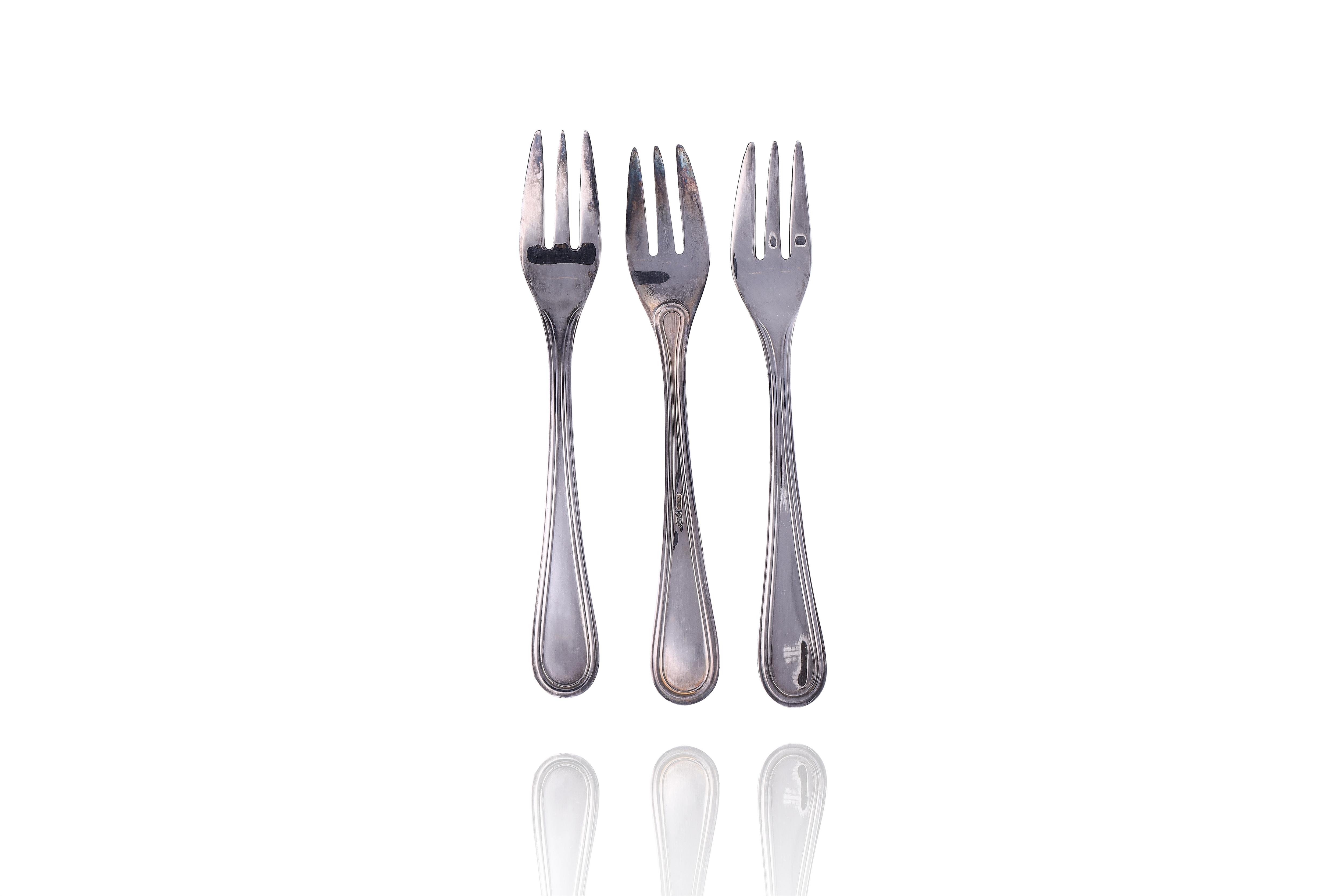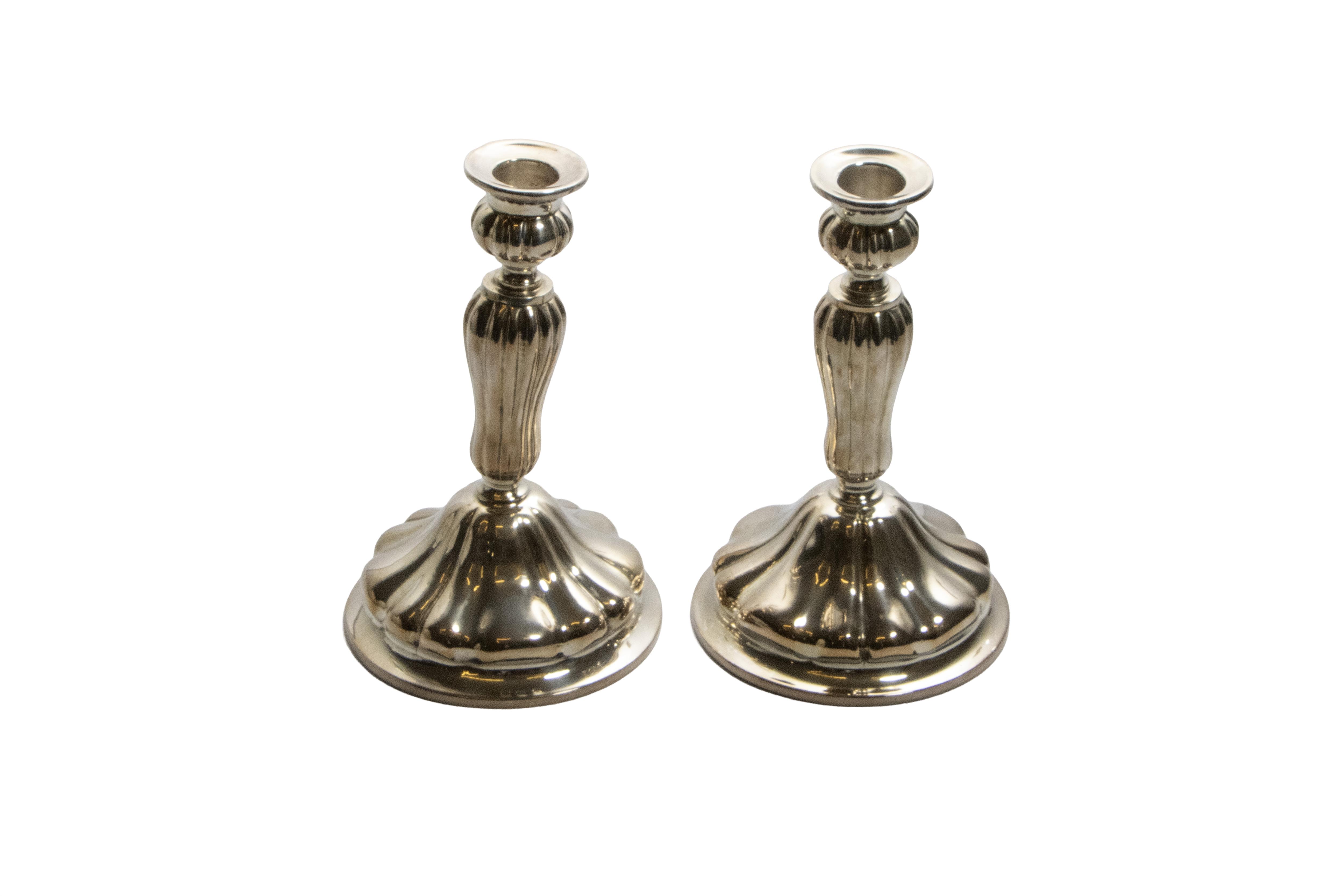 Coppia di candelieri realizzati in argento 800 decorati con baccellature, h cm 19, uno con ammaccature, difetti