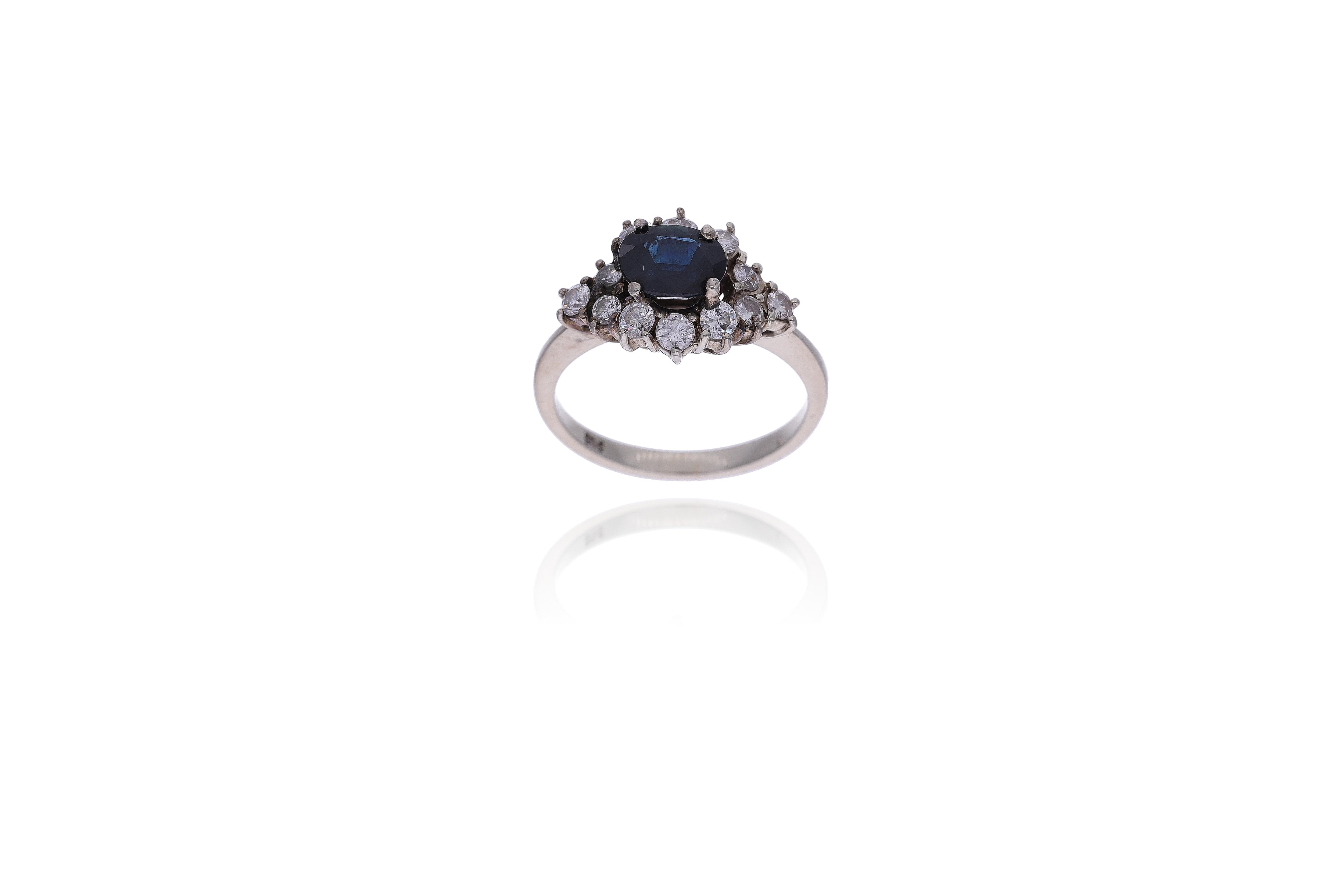 Anello con zaffiro e diamanti, in oro bianco 750, diamanti taglio brillante ct 0,60 totali circa, colore I-K, purezza VS-SI, misura 13,5, parti ammaccate, difetti