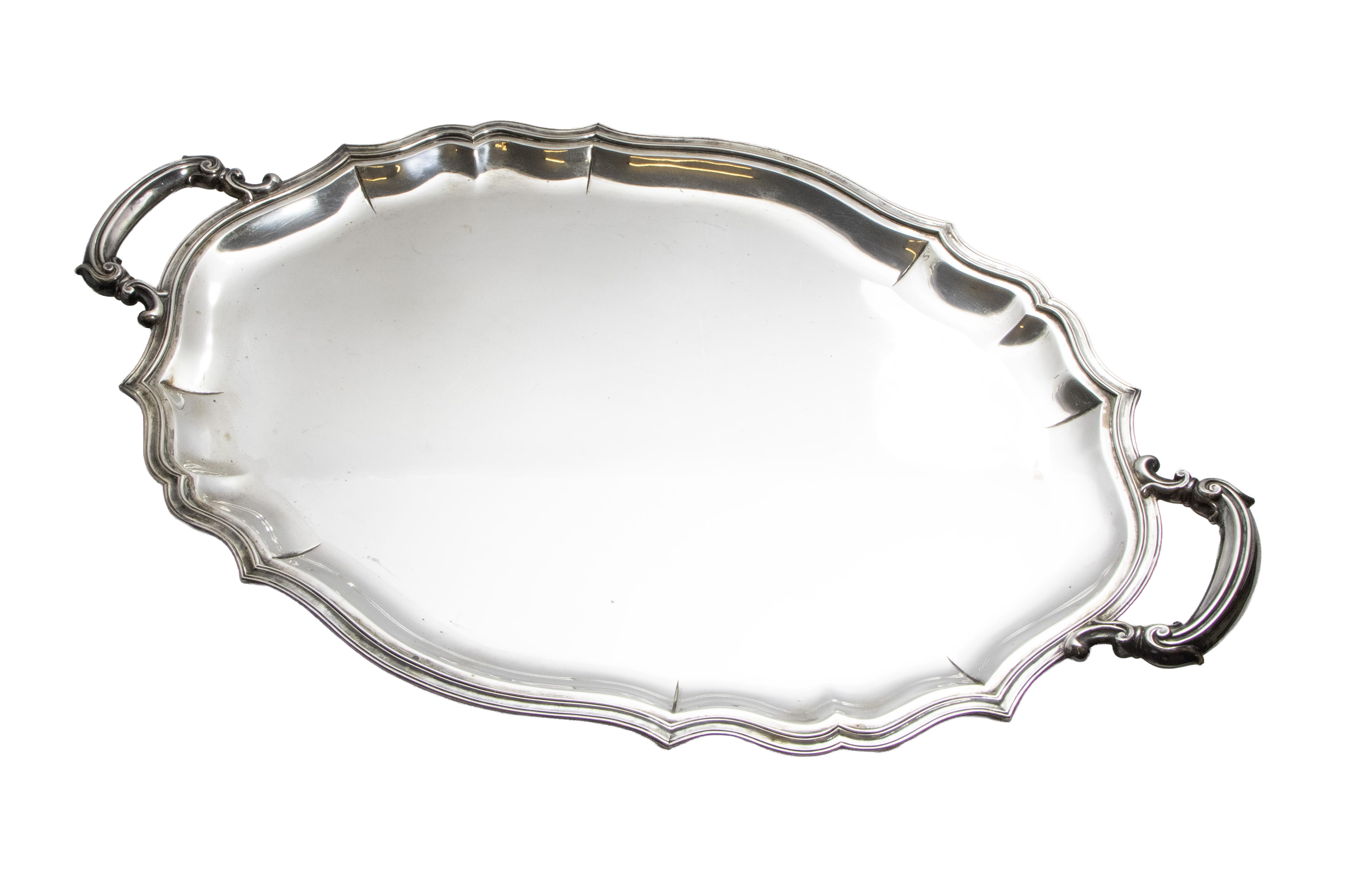 Vassoio realizzato in argento 800 con due manici, dimensioni 68 x 44 cm, parti graffiate, difetti
