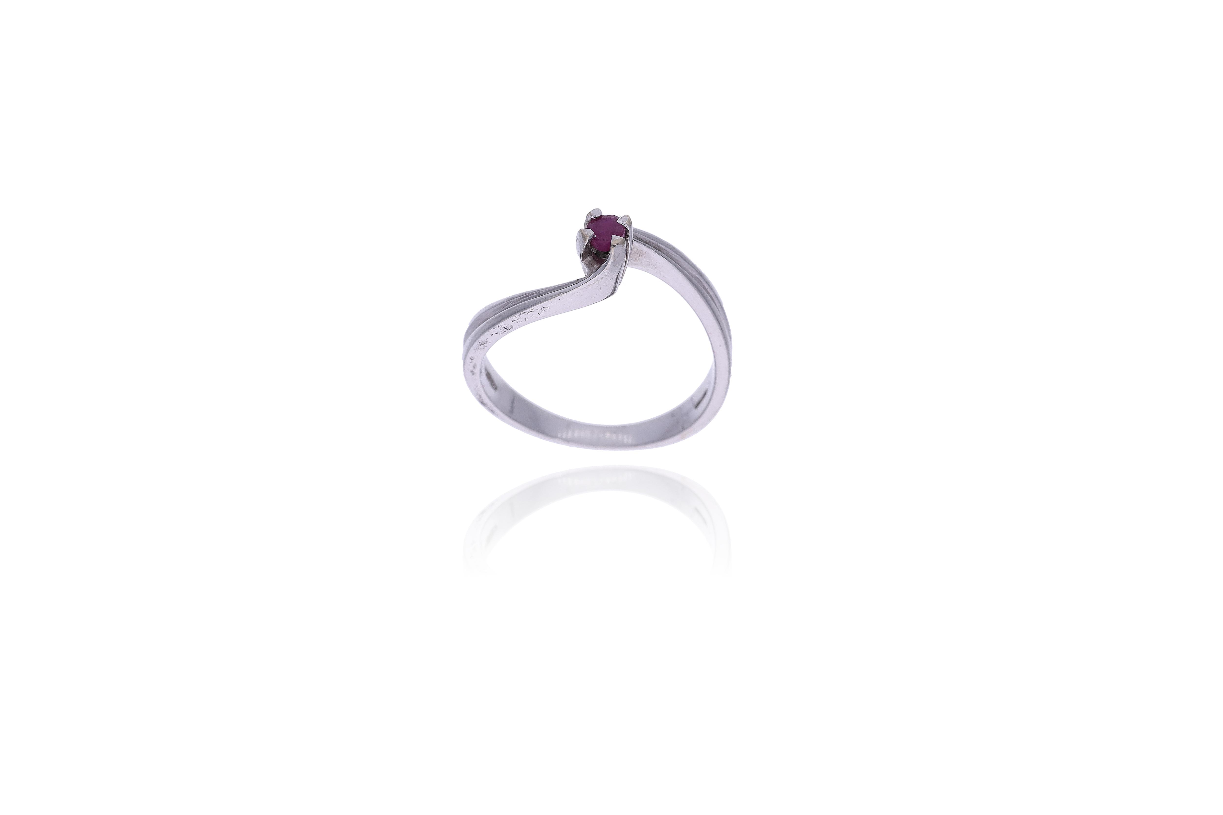 Anello con rubino, realizzato in oro bianco 750, rubino taglio composito forma rotonda, misura 15, difetti
